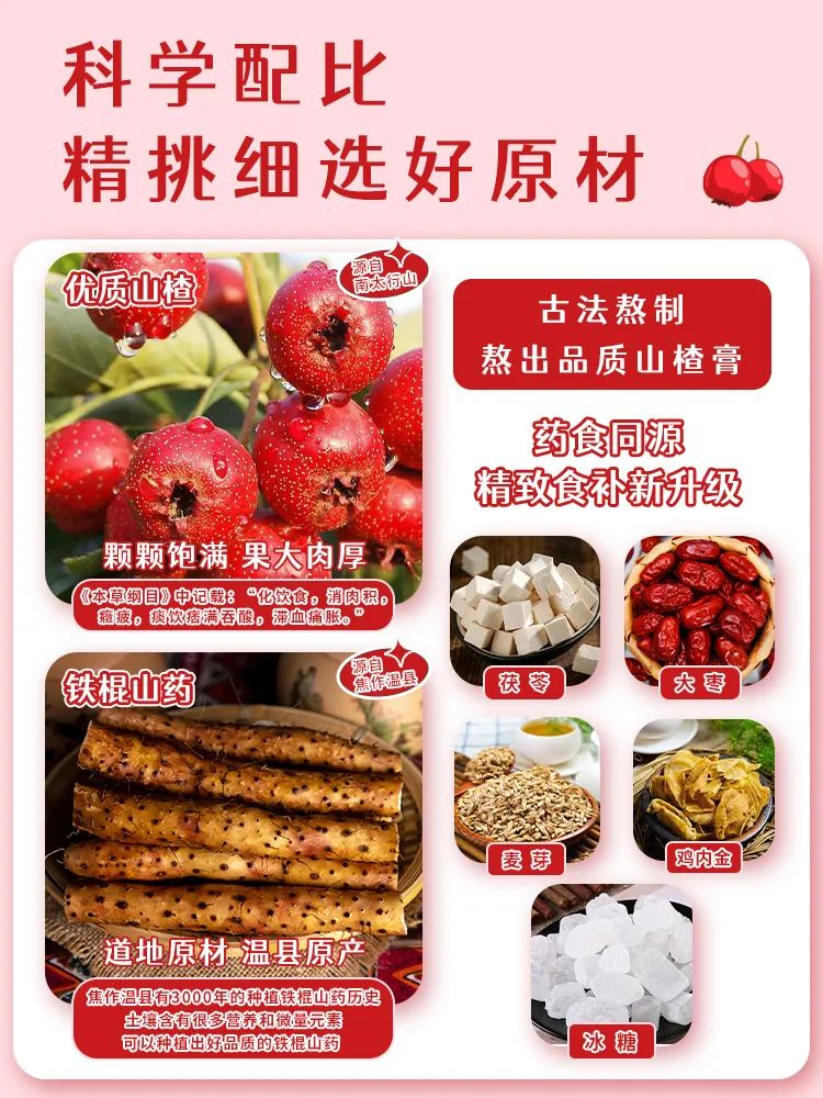 精选优质道地食材,来自太行山的山楂,以及河南温县的垆土铁棍山药,真材实料,科学合理配比。